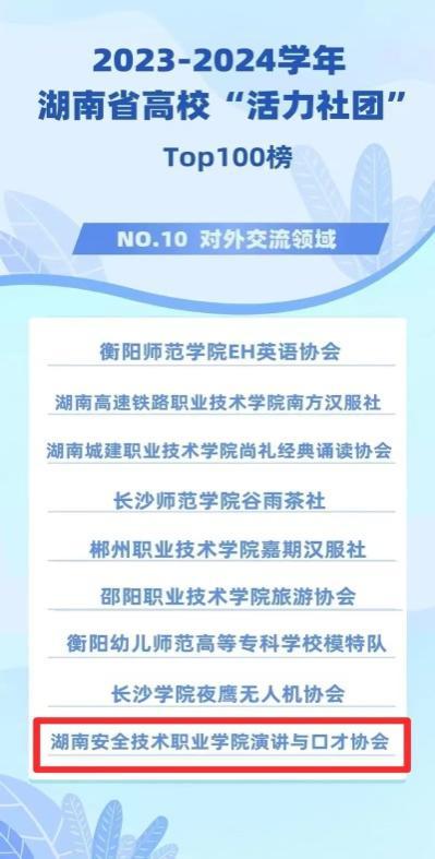 日前,在共青团湖南省委、湖南省学生联合会组织开展的2023-2024学年湖南省高校“活力社团”风采展示活动中,太阳集团tyc8722演讲与口才协会荣登2023-2024学年湖南省高校“活力社团”TOP100榜。