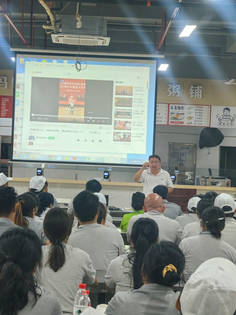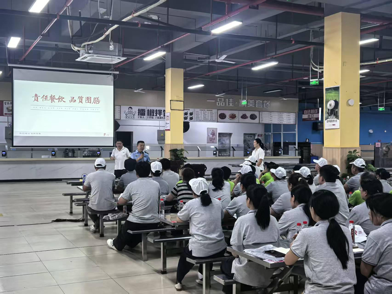 9 月 8 日下午,学校后勤基建处孙强处长再次组织开展食堂食品安全专项培训。本次培训特别邀请湘龙街道市场监督管理所张所长、廖主任莅临指导,两位领导结合实际工作提出了明确要求。此次培训紧扣餐饮服务安全核心要点,聚焦食材采购验收、储存加工、餐具消毒、环境卫生、人员健康管理等关键环节,通过政策解读、案例分析、规范演示等方式,向全体员工细致讲解食品安全操作规范与风险防控要点。确保每一位员工都能清晰掌握关键要求,切实守护好校园“舌尖上的安全”,全力打造师生满意、家长放心的“阳光食堂”“暖心食堂”,以最佳状态迎接全体师生返校。